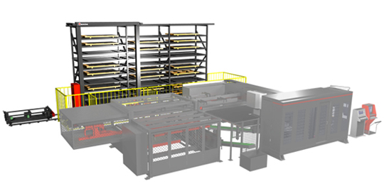 支持長時間自動運轉的材料供給、產品堆垛的系統。將材料的單張取板、搬入、加工后產品的搬出及堆垛操作自動化。加工機的前側為開放空間,能夠方便切換至加工機本體的手動加工。